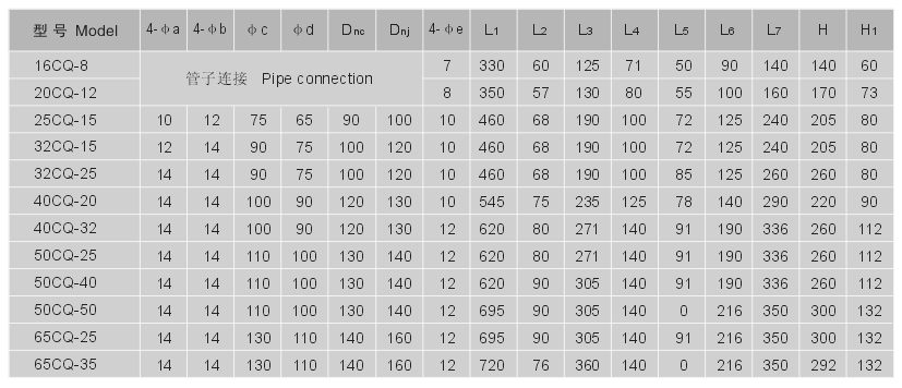 | 40CQ-40 | 40 | 32 | 40 | 200 | 4 | 〃 | 〃 | 8 |