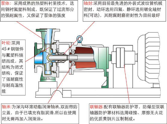 該泵具有耐腐、耐磨、耐高溫、不老化、機(jī)械強(qiáng)度高、運(yùn)轉(zhuǎn)平穩(wěn)、結(jié)構(gòu)先進(jìn)合理、密封性能?chē)?yán)格可靠、拆卸檢修方便、使用壽命長(zhǎng)等優(yōu)點(diǎn),廣泛適用于化工、制藥、石油、冶金、冶煉、電力、電鍍、染料、農(nóng)藥、造紙、食品、紡織等行業(yè),在-85℃~200℃溫度條件下長(zhǎng)期輸送任意濃度的硫酸、鹽酸、氫氟酸、硝酸、王水、強(qiáng)堿、強(qiáng)氧化劑、有機(jī)溶劑、還原劑等強(qiáng)腐蝕介質(zhì),是目前世界是最耐腐蝕設(shè)備之一。