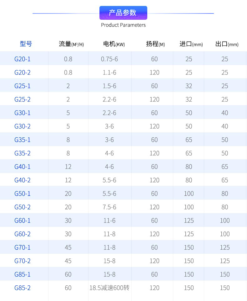 2、對(duì)于不同的介質(zhì)、不同的轉(zhuǎn)速,性能參數(shù)都將變化,其流量值與濃度、粘度成反比,與轉(zhuǎn)速成正比;